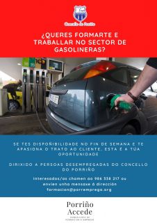 Porremprego pon en marcha un novo programa a través do Porriño Accede para persoas que estean interesadas no sector das gasolineiras. As persoas que estean desempregadas, teñan dispoñibilidade no fin de semana e sexan do Porriño poden pórse en contacto no 986 338 217 ou no formacion@porremprego.org